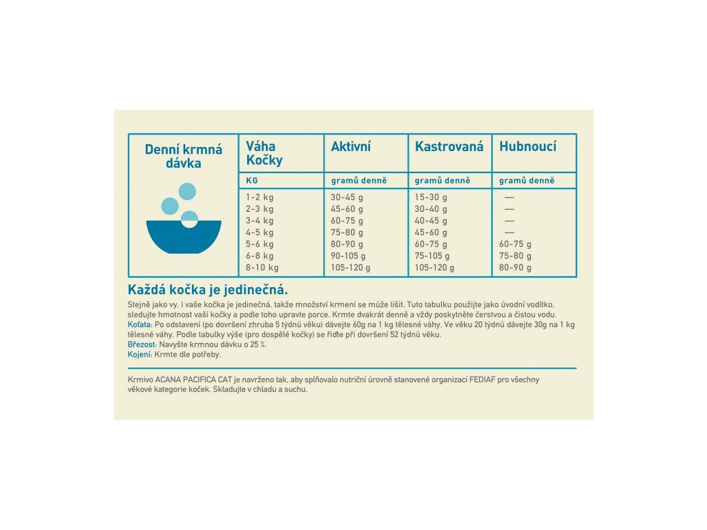Kontaktní údaje: Champion Petfoods LP. 52432 Higway 60, Acheson, Alberta, Kanada. T7X 5A6. EU REG: PF-29., http://www.acana.com/, Dovozce: Miroslav Weber-Mlýn s.r.o., Masarykova 159, 26801 Hořovice, email: orijen@acana.cz, www.weber-mlyn.cz