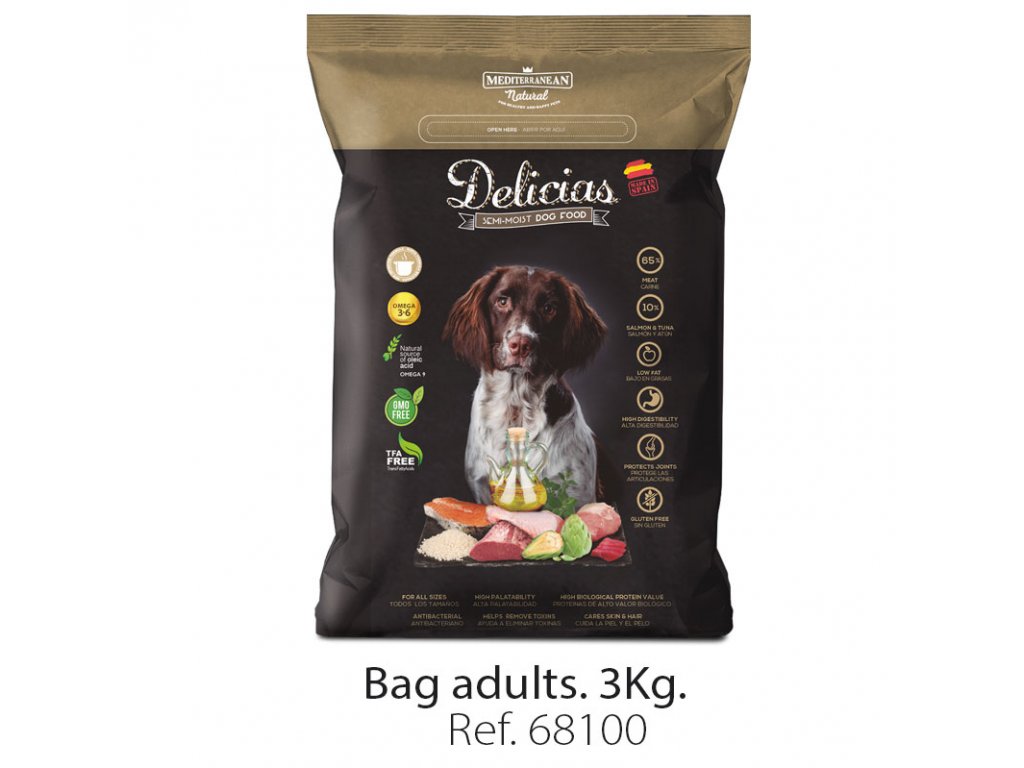 Přírodní středomořské velmi chutné krmivo pro psy Mediterranean Natural Delicias je kompletní polovlhké krmivo pro dospělé psy a štěňata s vysokou stravitelností. Polovlhké krmivo pro dospělé psy (s vylepšenou recepturou) je speciálně vyrobeno pro malá a středně plemena psů, jakož i pro psy s obtížemi při kousání. Kompletní krmivo od Mediterranean Natural obsahuje maso a ryby vhodné pro lidskou spotřebu, výtažek z krevet a krabího extraktu (zdroj glukosaminu) na podporu rozvoje chrupavčitých tkání a výtažek z artyčoků (lahůdky pro dospělé), který pomáhá při regeneraci jaterních buněk, a odstraňuje to cholesterol. Díky oleji z oregana a rozmarýnu s vysokou antibakteriální silou napomáhá i správnému gastrointestinálnímu průchodu. Zároveň je to nízkotučné jídlo a pečuje o pokožku a vlasy, udržuje je zdravé a lesklé. Pro vynikající chuť, vhodné také jako odměny při výcviku.